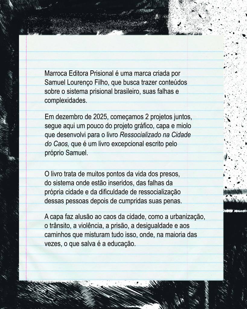 Recentemente concluí o projeto gráfico do livro “Ressocializado na cidade do caos”, publicado pela Marroca Editora.